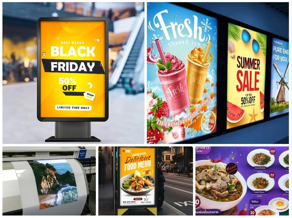 Widely used for POP Displays, Tradeshow Graphics, Window Graphics, Backlit Displays and the closed urban lightboxes at bus station, Boards, Wall frames, Advertising signs, Shops, Restaurants, Cinemas etc.to display with enlarged photographs to make people clearly notice.