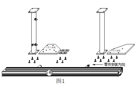 2. The second step, as shown in Figure 2: Flip the No. 1 beam, first along the groove of the No. 2 beam, install a block from right to left, and then install the No. 2 beam from left to right through the No. 2 triangular plate, along the Each of the two grooves on the right end of the beam is installed with a block, and then the No. 3 machine foot and the No. 3 triangle plate;